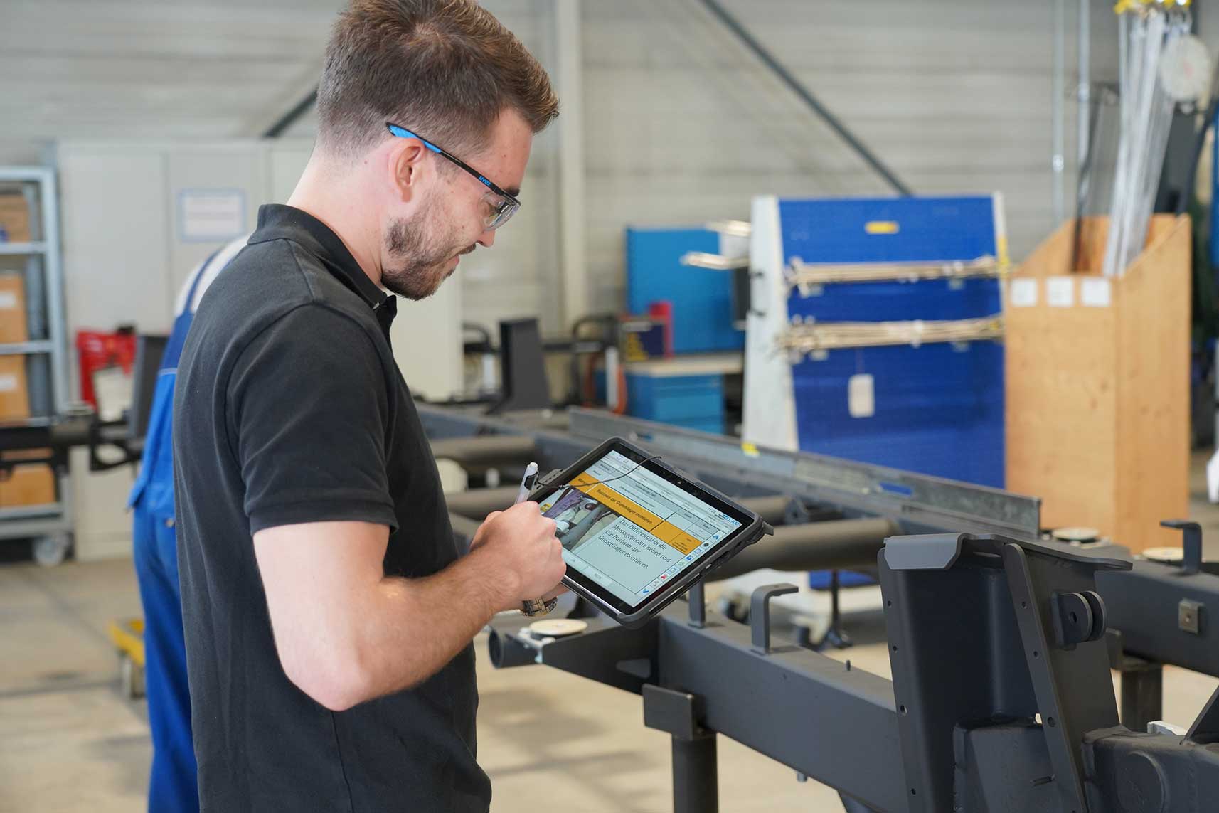 După trecerea la documente digitizate de producție, instrucțiunile de lucru sunt actualizate automat din ERP, oferind trasee de audit pentru schimbările reviziei. Instrucțiunile de lucru și documentația relevantă sunt afișate pe tablete pentru fiecare lucrător, iar dispozitivele de producție de pe linia de asamblare, precum unelte inteligente și echipamente de testare, sunt conectate la sistem, asigurând trasabilitatea calității.